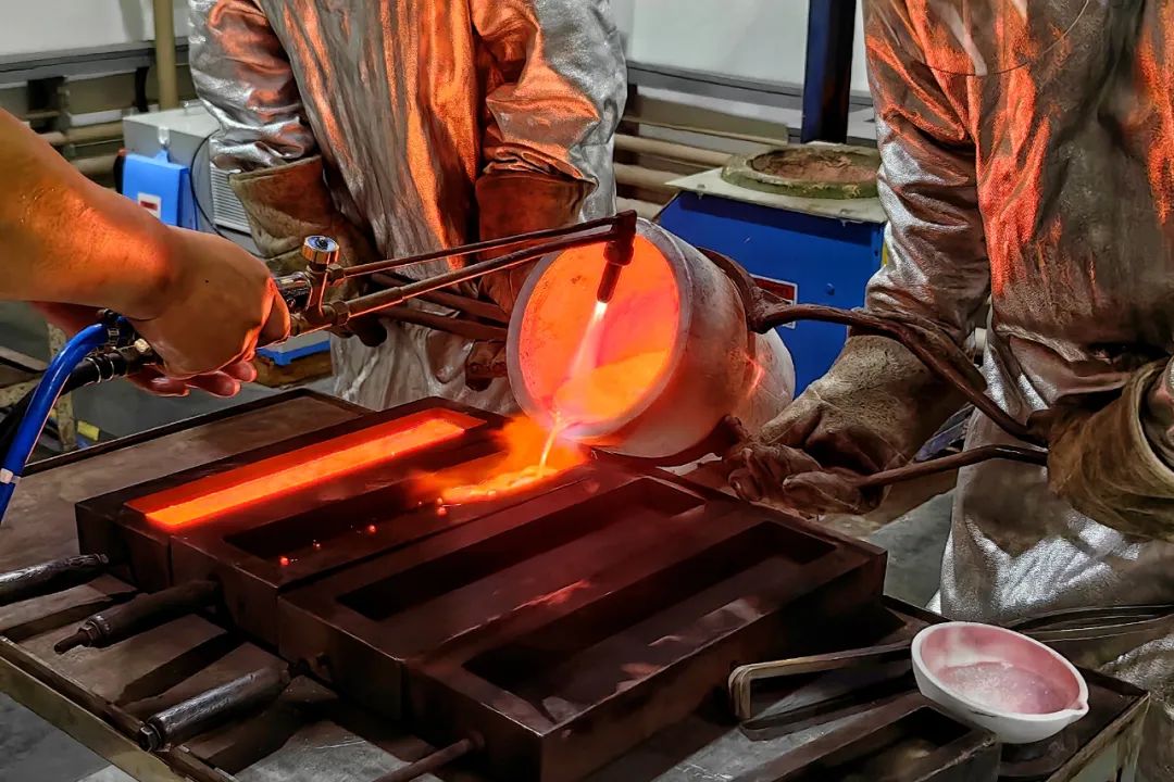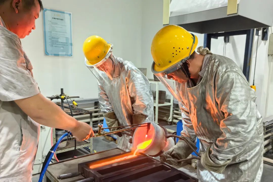 一小時后,坩堝中的金料已經(jīng)變成了金水,張文龍喊了兩位同事,共同進行澆鑄這一環(huán)節(jié)。其中一位同事李玉奇,今年52歲,在工廠已經(jīng)十年了,算是張文龍的師父。他們都做好全身防護,戴上安全頭盔,放下面罩,二人合力將坩堝抬起,將金水倒入模具中。